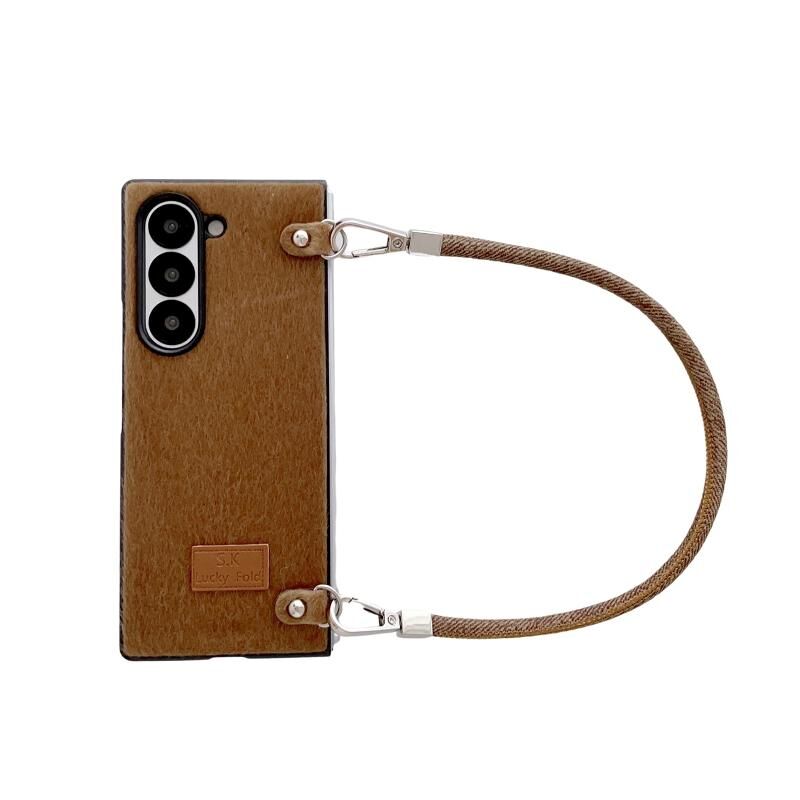 Για Samsung Galaxy Z Fold4 5G Άνετη σύντομη βελούδινη θήκη τηλεφώνου πλήρους κάλυψης με λουράκι καρπού (Καφέ)