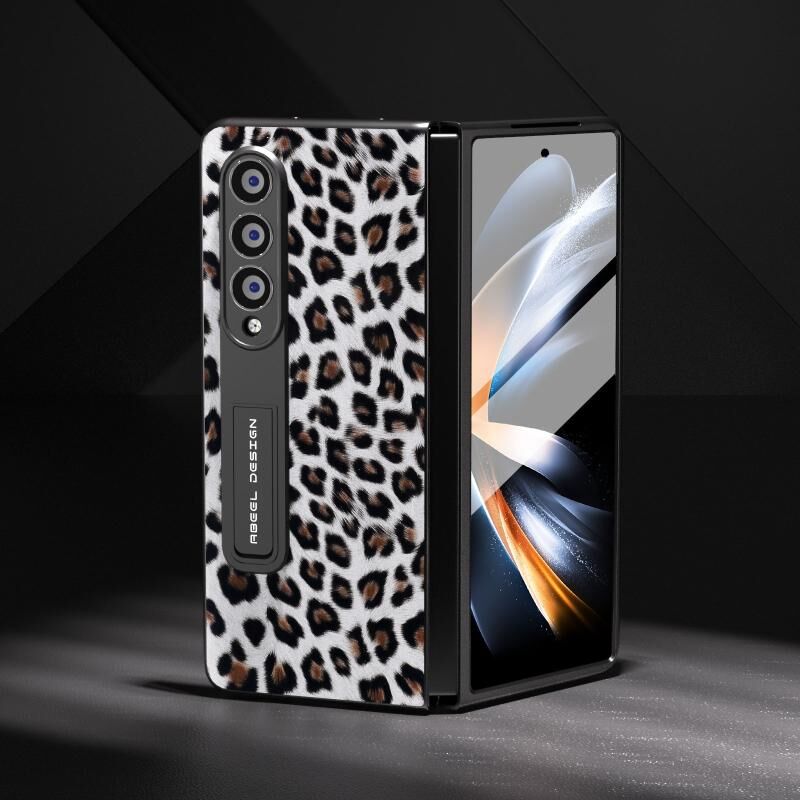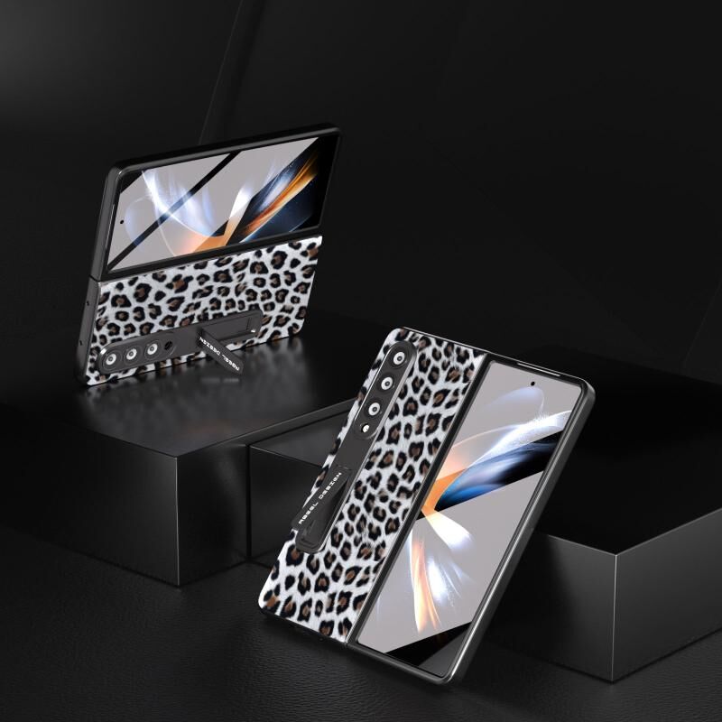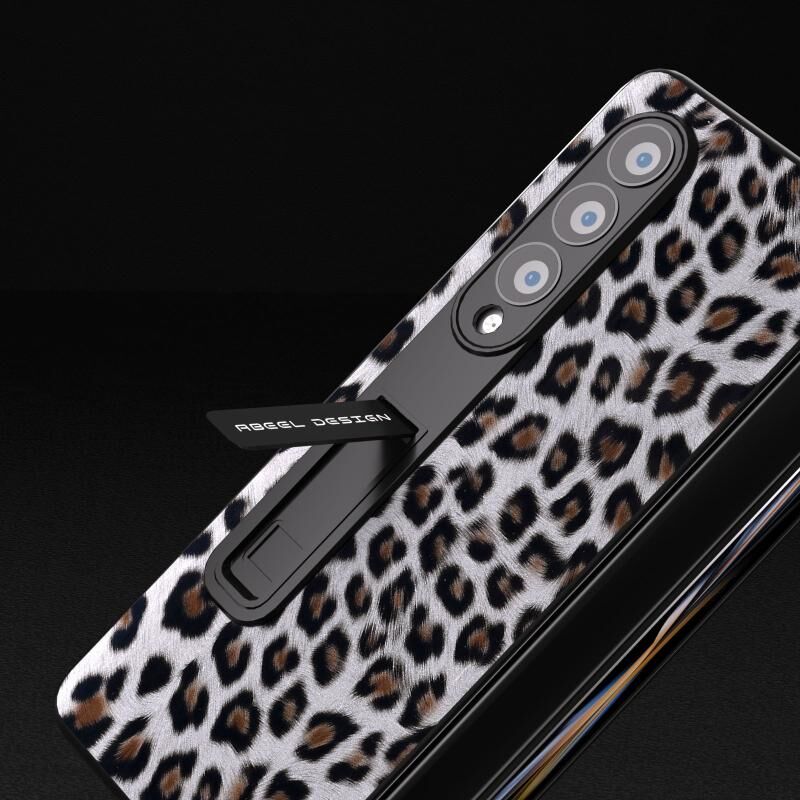 Θήκη τηλεφώνου για Samsung Galaxy Z Fold4 5G, ενσωματωμένη, μαύρη με λεπτομέρειες λεοπάρδαλης και βάση στήριξης (Χρυσό).