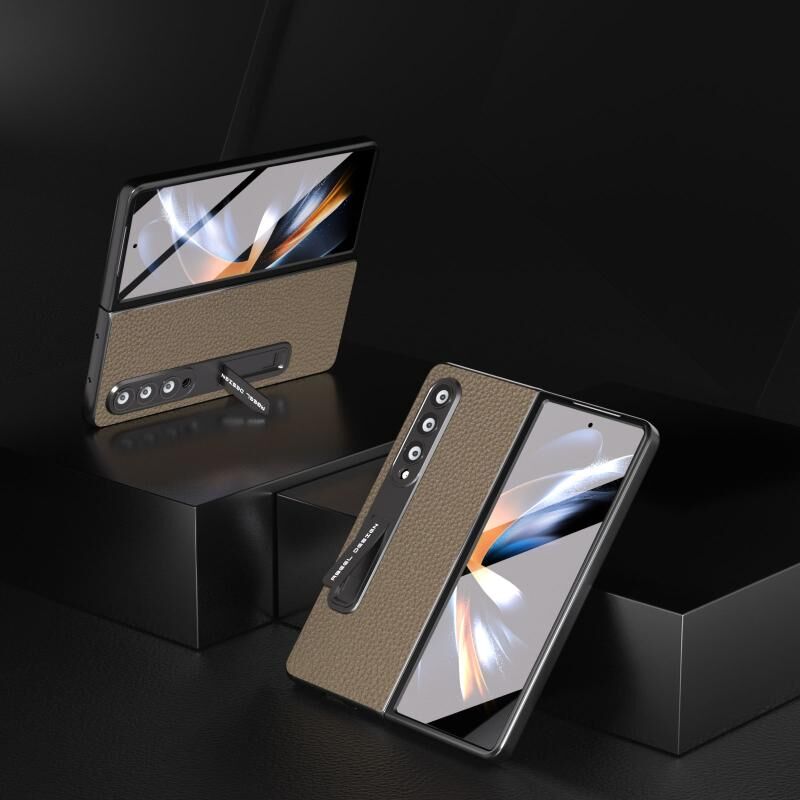 Θήκη τηλεφώνου από γνήσιο δέρμα Litchi για Samsung Galaxy Z Fold4 5G με ενσωματωμένη βάση (Μαύρο)