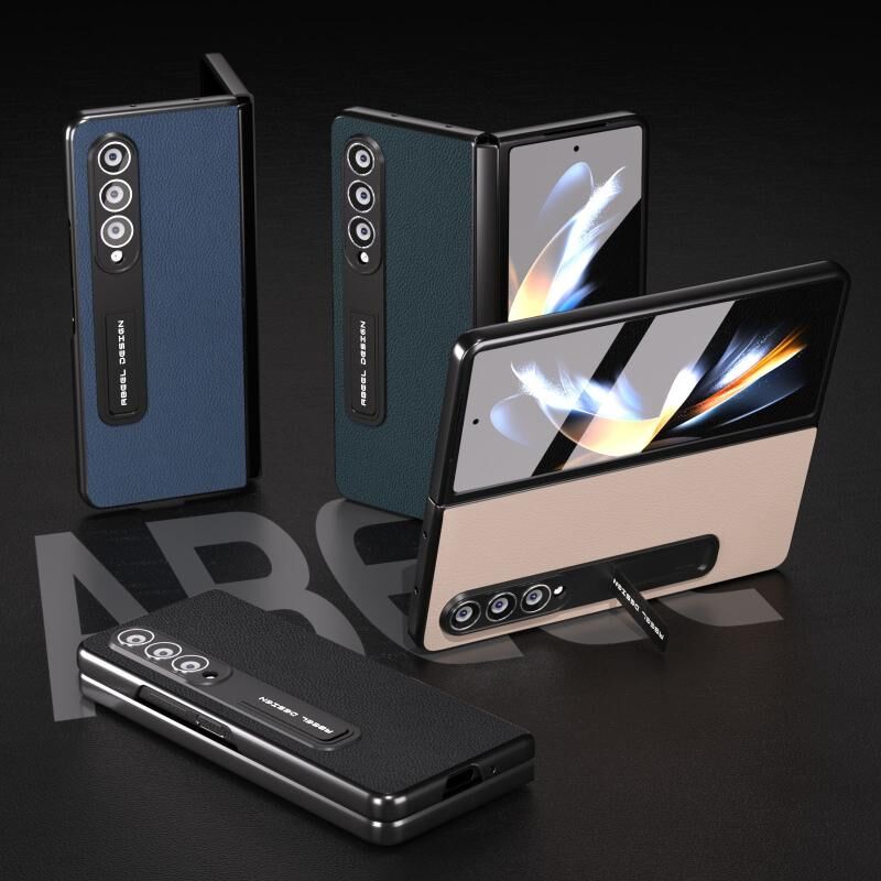 Θήκη τηλεφώνου Samsung Galaxy Z Fold4 5G με ενσωματωμένο γνήσιο δέρμα + PC με υφή Litchi και βάση στήριξης (Μπλε)