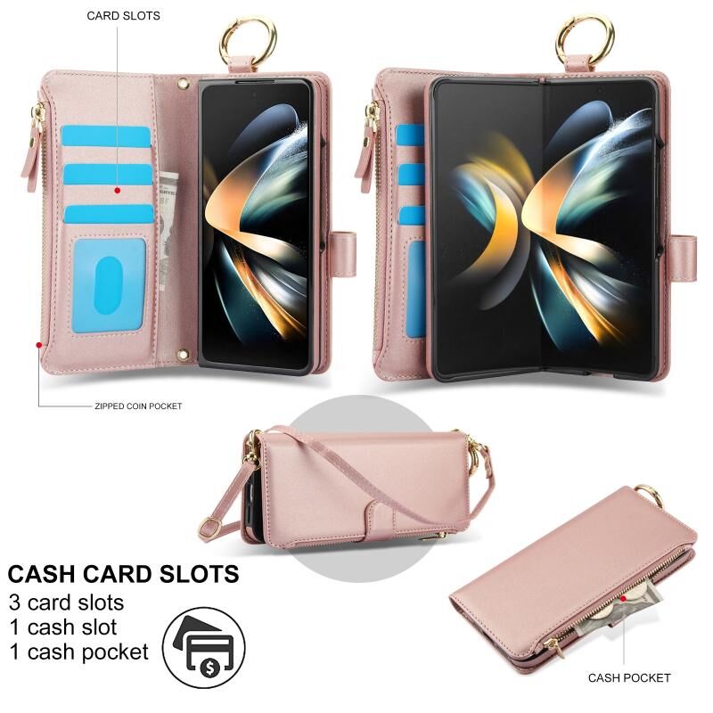 Για Samsung Galaxy Z Fold4 Crossbody δαχτυλίδι πολυλειτουργικό πορτοφόλι Fold δερμάτινη θήκη τηλεφώνου (Rose Gold)
