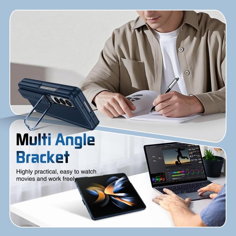 For Samsung Galaxy Z Fold4 Film Integrated Lens Frame Bracket Phone Case with Wristband(Dark Blue)