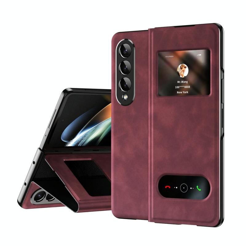 Για Samsung Galaxy Z Fold4 ώριμη παράθυρο View Flip υπόθεση τηλεφώνου δέρμα (κόκκινο Nappa)