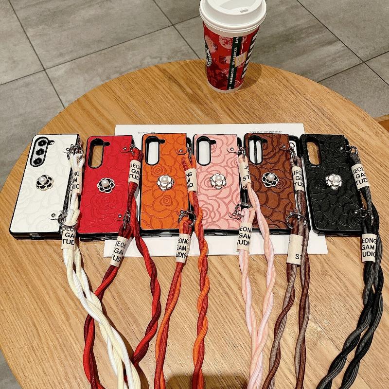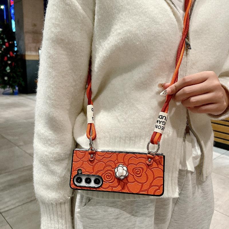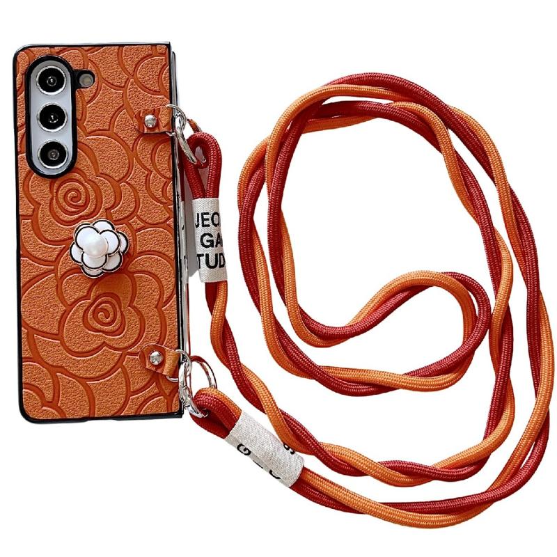 For Samsung Galaxy Z Fold5 5G Impression Camellia Pattern Protective Phone Case with Long Lanyard(Orange)