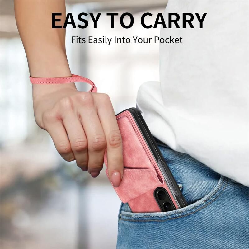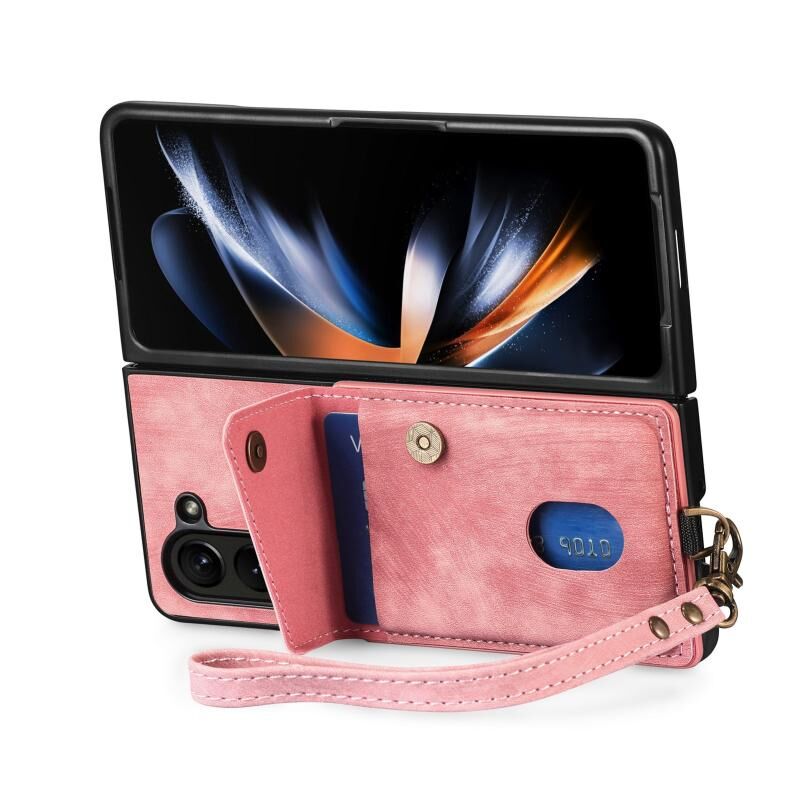 Για Samsung Galaxy Z Fold5 5G Ρετρό κάρτα πορτοφόλι πτυσσόμενο δερμάτινη θήκη τηλεφώνου με λουράκι (ροζ)