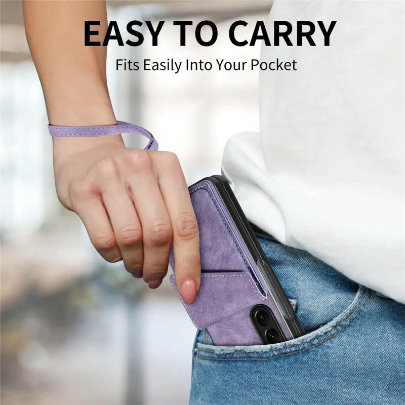 Για Samsung Galaxy Z Fold5 5G Ρετρό κάρτα πορτοφόλι πτυσσόμενο δερμάτινη θήκη τηλεφώνου με λουράκι (μωβ)