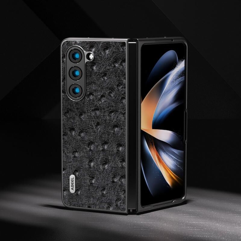 Θήκη τηλεφώνου από γνήσιο δέρμα στρουθοκάμπου με υφή για Samsung Galaxy Z Fold5 (Μαύρο)