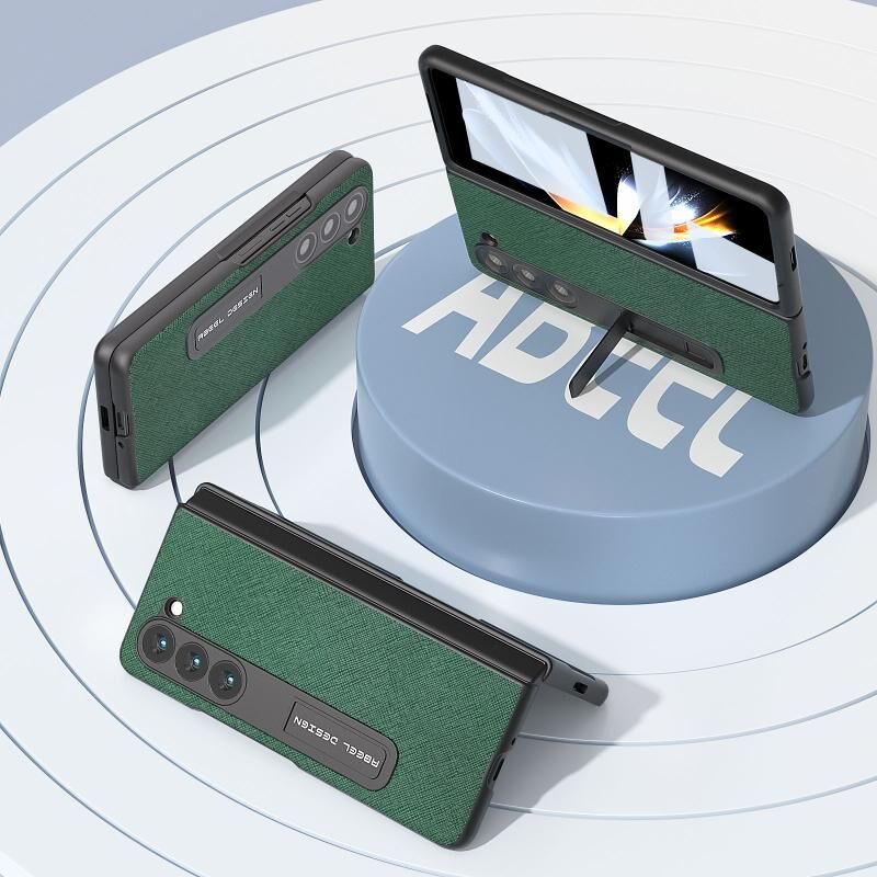 Θήκη τηλεφώνου από γνήσιο δέρμα με ενσωματωμένη διασταυρούμενη υφή ABEEL για Samsung Galaxy Z Fold5 με βάση στήριξης (Μαύρο)