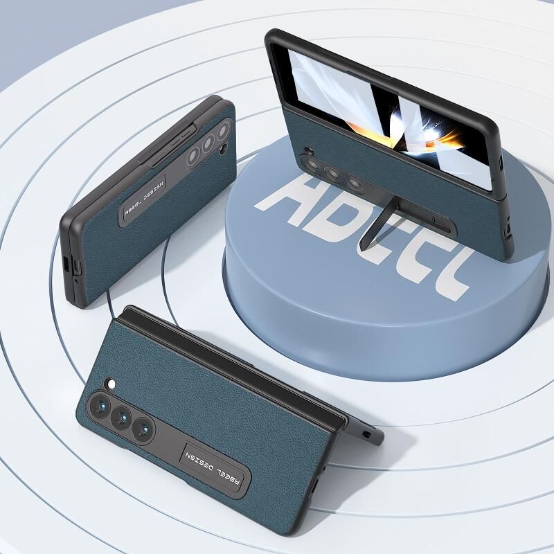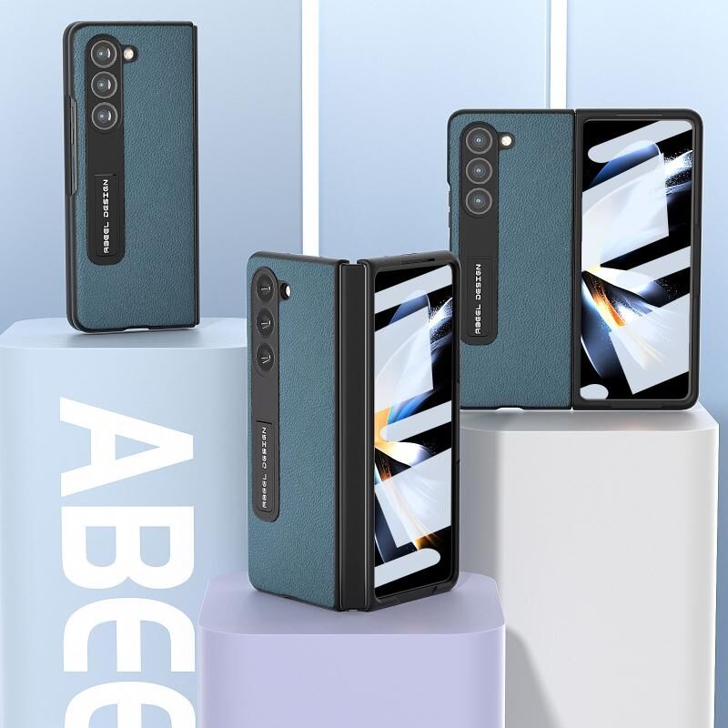 Θήκη τηλεφώνου Samsung Galaxy Z Fold5 ABEEL με ενσωματωμένο γνήσιο δέρμα + PC με υφή λυτσί και βάση στήριξης (Μπλε)