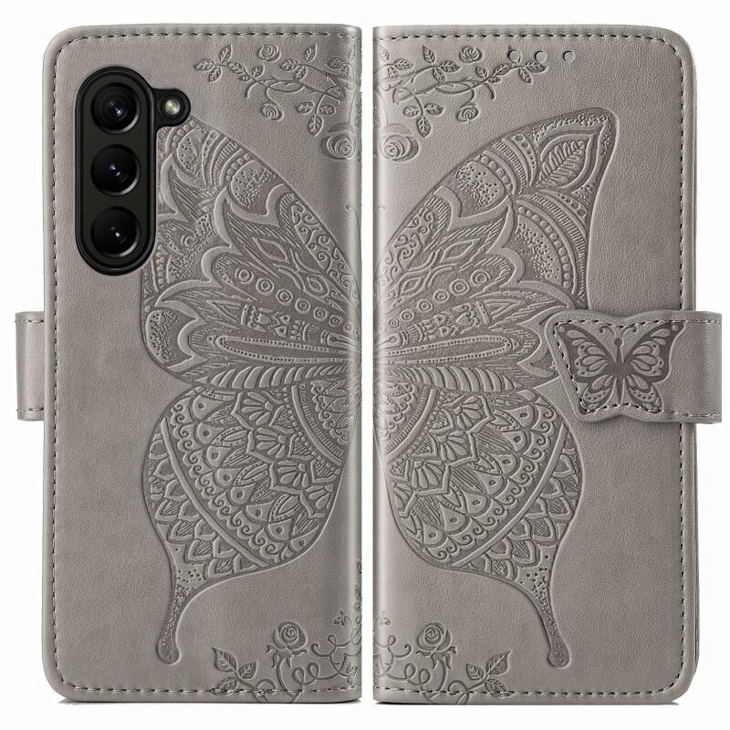 Για Samsung Galaxy Z Fold5 πεταλούδα αγάπη λουλούδι ανάγλυφο δερμάτινη θήκη τηλεφώνου (γκρι)