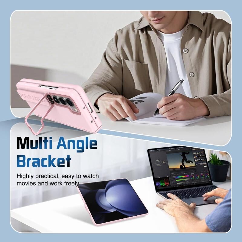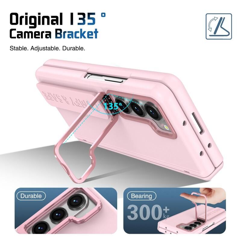 For Samsung Galaxy Z Fold5 Film Integrated Lens Frame Bracket Phone Case with Wristband(Pink)