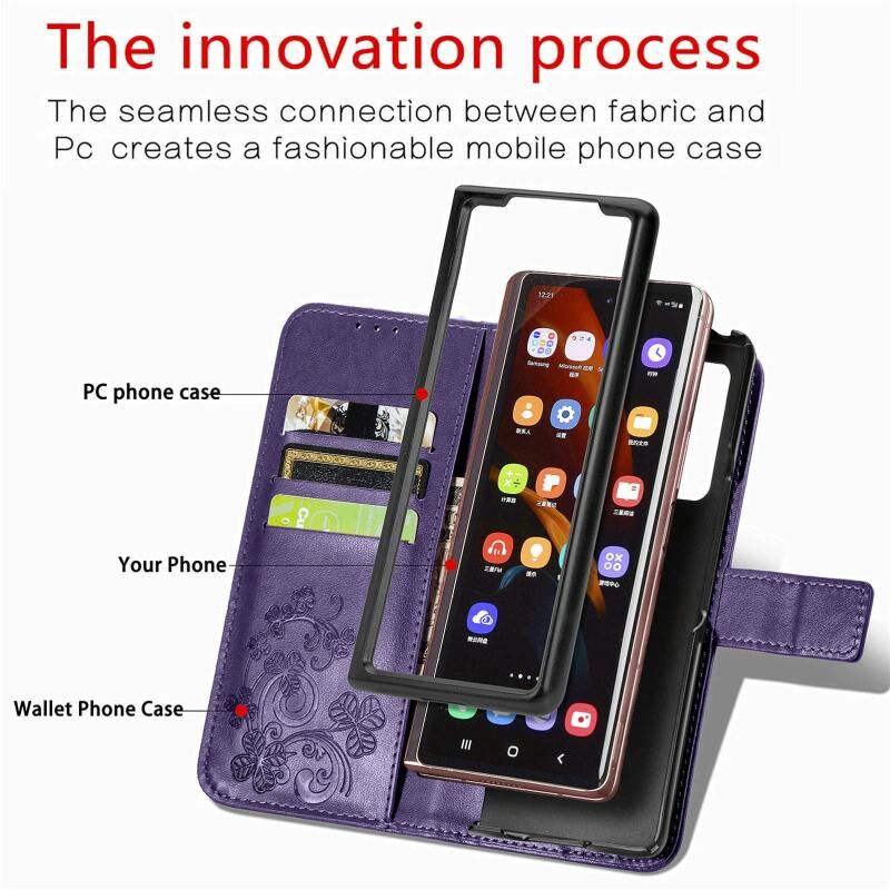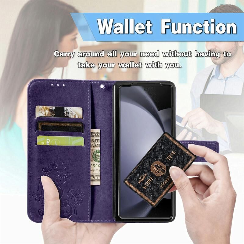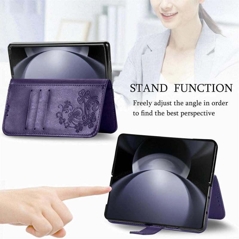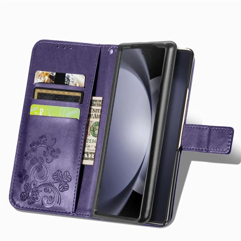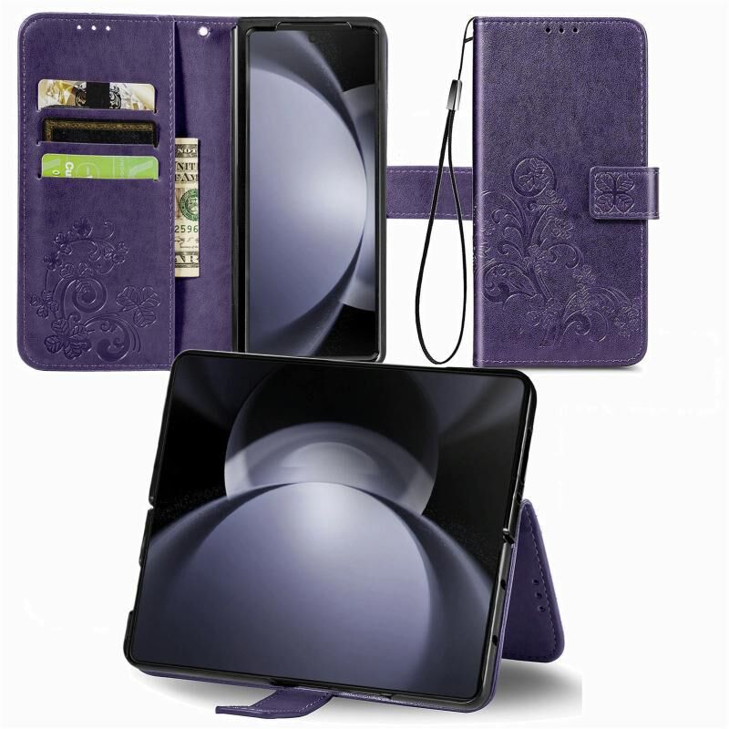 Για Samsung Galaxy Z Fold5 Four-leaf κούμπωμα ανάγλυφο πόρπη δερμάτινη θήκη τηλεφώνου (μωβ)