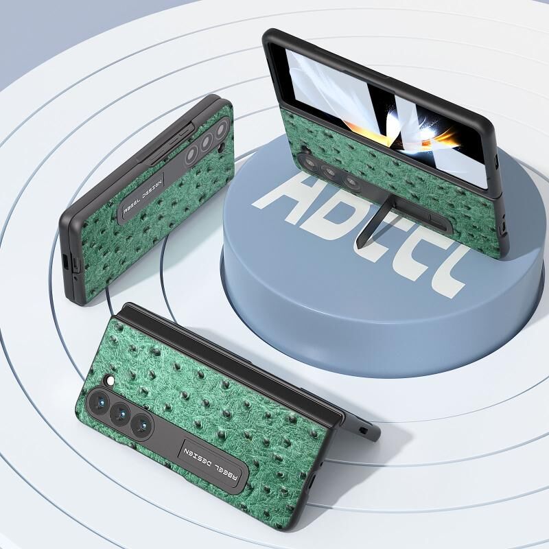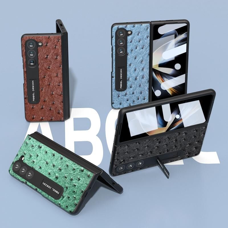 Θήκη τηλεφώνου από γνήσιο δέρμα στρουθοκάμπου με ενσωματωμένο στήριγμα για Samsung Galaxy Z Fold5 (Μπλε)