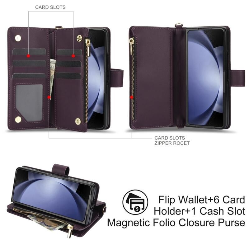 Για Samsung Galaxy Z Fold5 Rhombic φερμουάρ κάρτα πορτοφόλι δερμάτινη θήκη τηλεφώνου με κορδόνι (σκούρο μωβ)