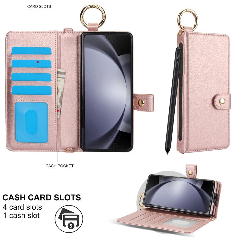 For Samsung Galaxy Z Fold5 Solid Color Wristband Ring RFID Leather Phone Case with Lanyard(Rose Gold)