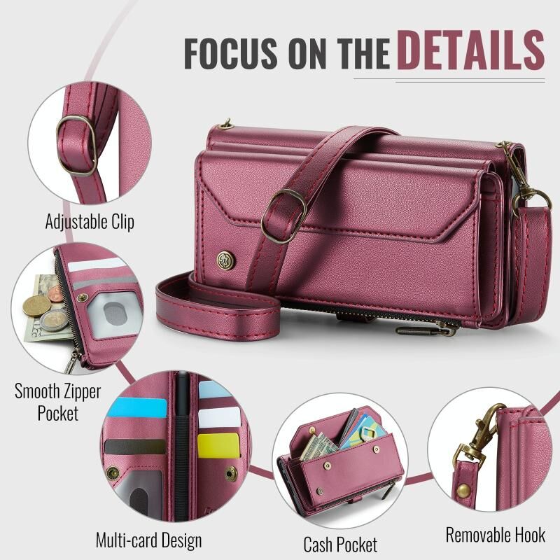6. 10 υποδοχές για κάρτες + 2 υποδοχές για μετρητά + 1 πορτοφόλι με φερμουάρ + Μακρύς ιμάντας ώμου + κοντός ιμάντας χεριού (στην πραγματικότητα με βάση την εικόνα)