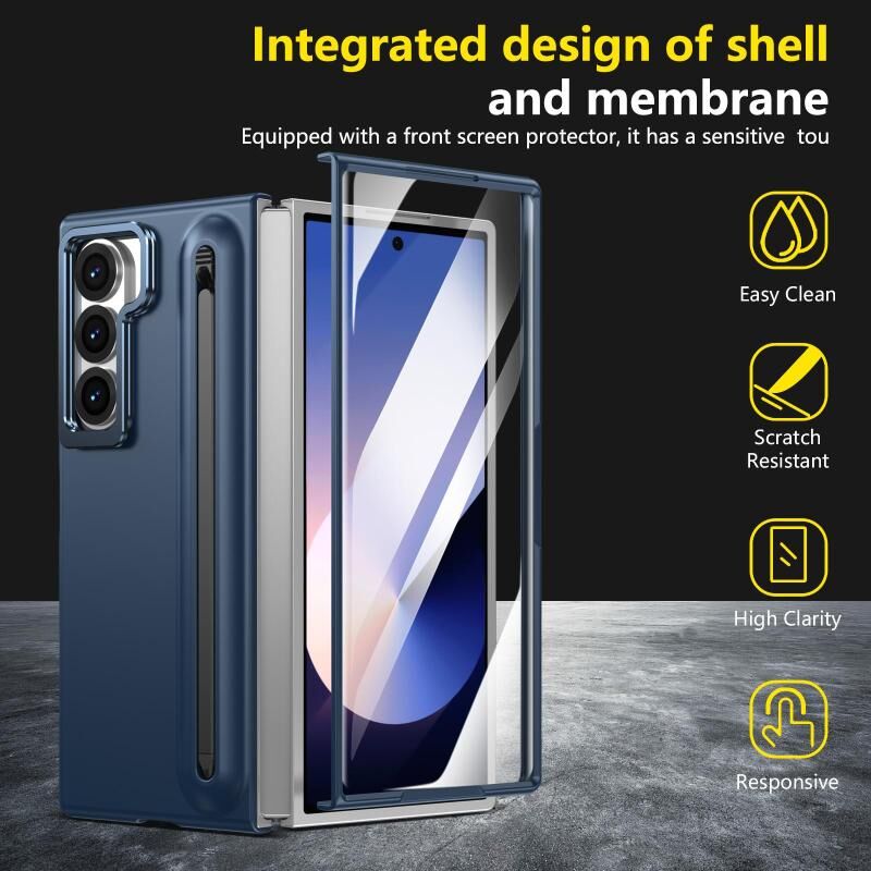 For Samsung Galaxy Z Fold6 5G Integrated Skin Feel Lens Folding Holder Pen Slot Shockproof Phone Case with Pen(Dark Blue)
