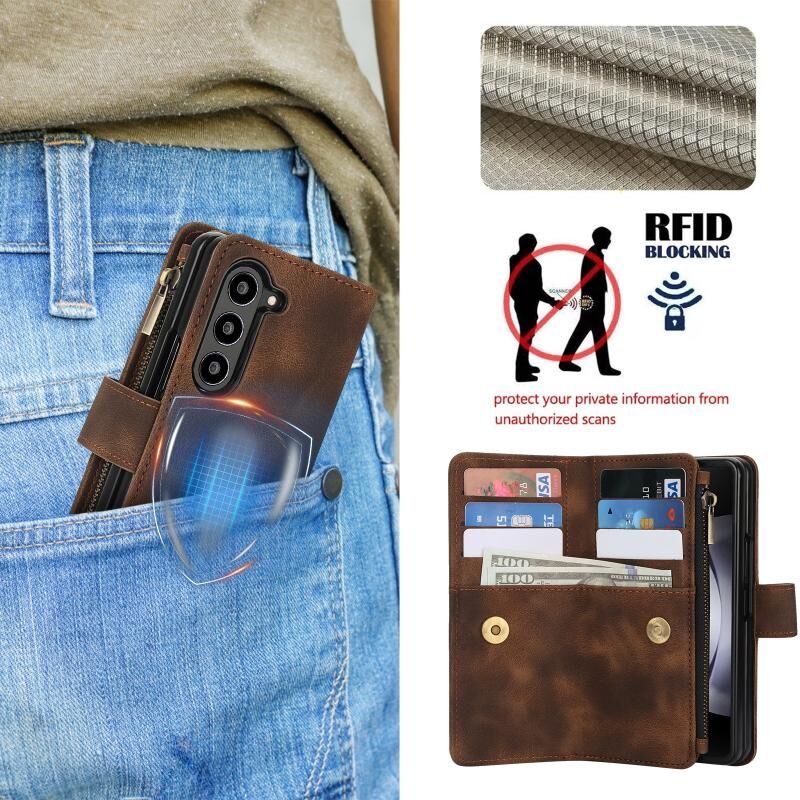 Για Samsung Galaxy Z Fold6 Dream 9-Card φερμουάρ πορτοφόλι RFID δερμάτινη θήκη τηλεφώνου με κορδόνι (καφέ)