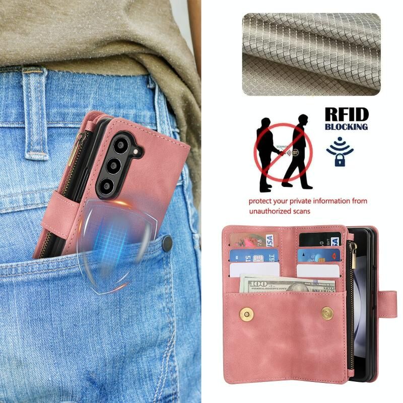 Για Samsung Galaxy Z Fold6 Dream 9-Card φερμουάρ πορτοφόλι RFID δερμάτινη θήκη τηλεφώνου με κορδόνι (Rose Gold)