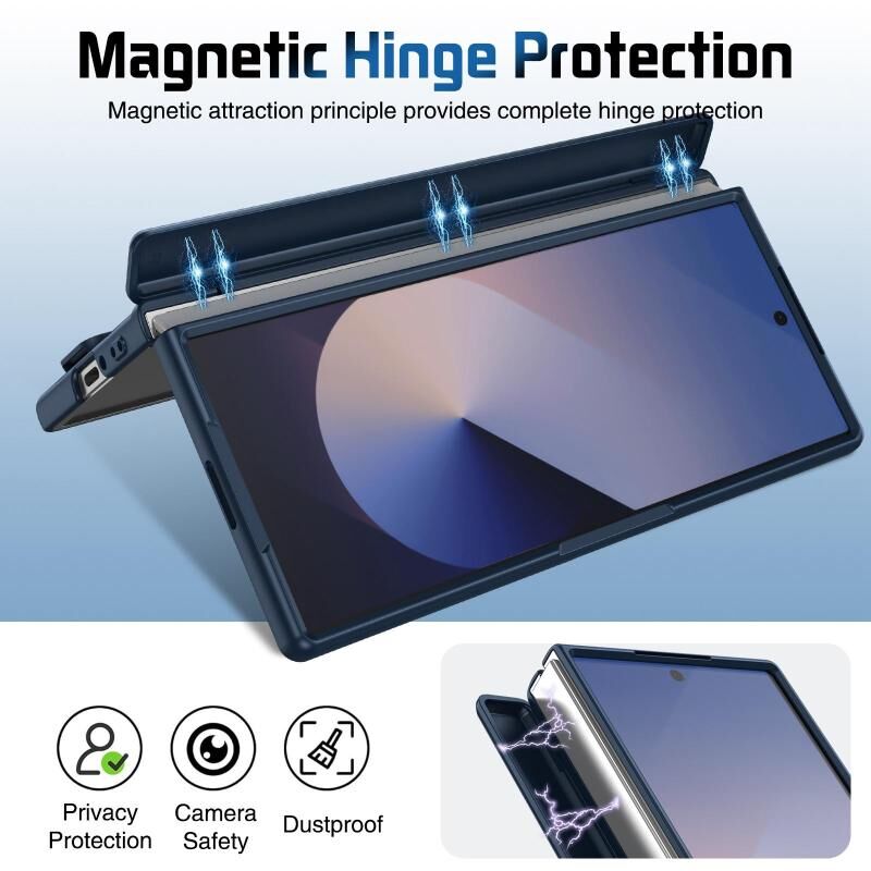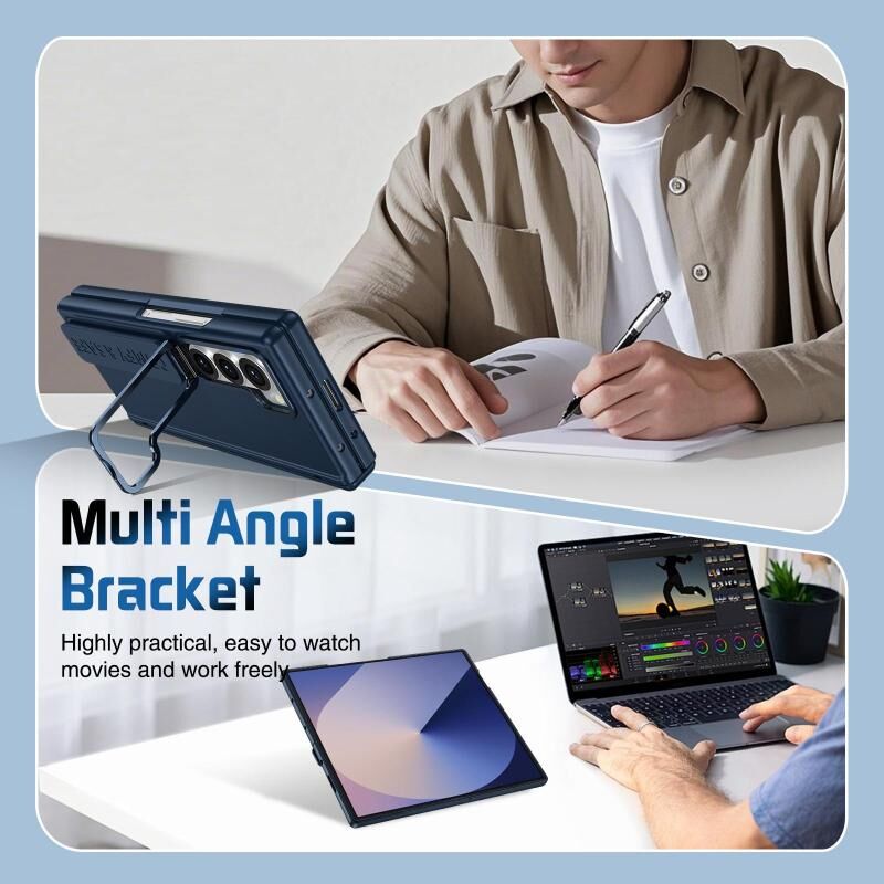 For Samsung Galaxy Z Fold6 Film Integrated Lens Frame Bracket Phone Case with Wristband(Dark Blue)