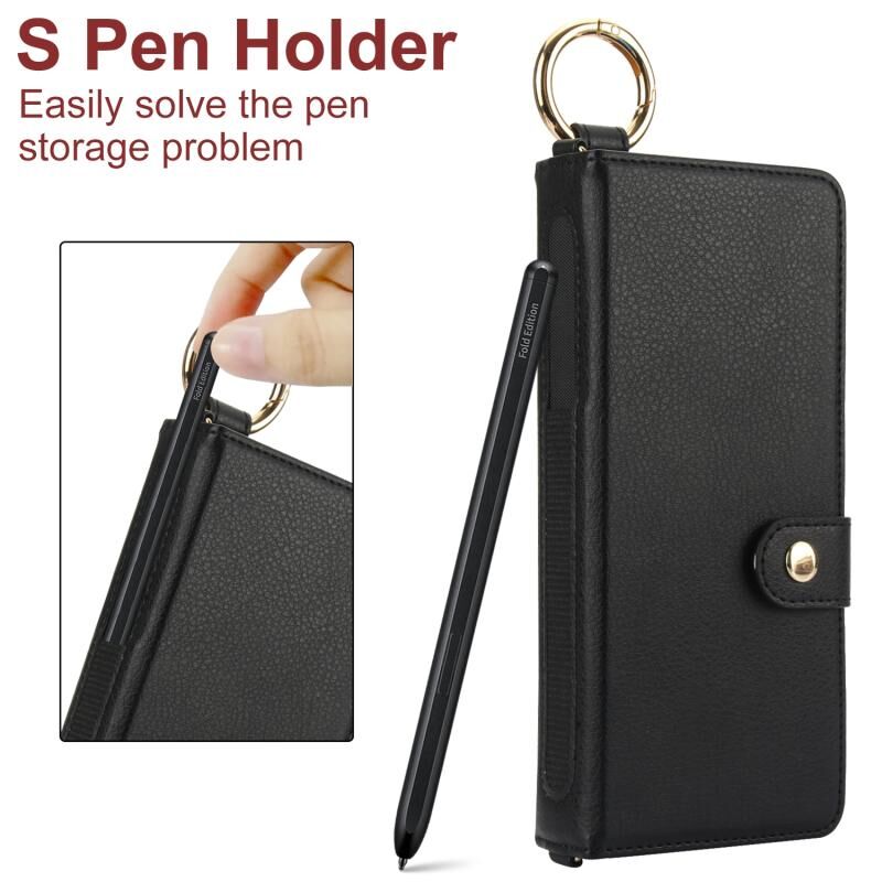 Θήκη τηλεφώνου Samsung Galaxy Z Fold6 από δέρμα με RFID, με λουρί και δακτύλιο για το καρπό, σε συμπαγές χρώμα (Μαύρο ανθρακονήματα).