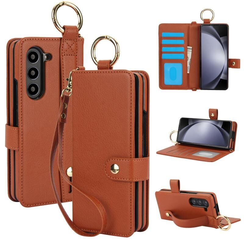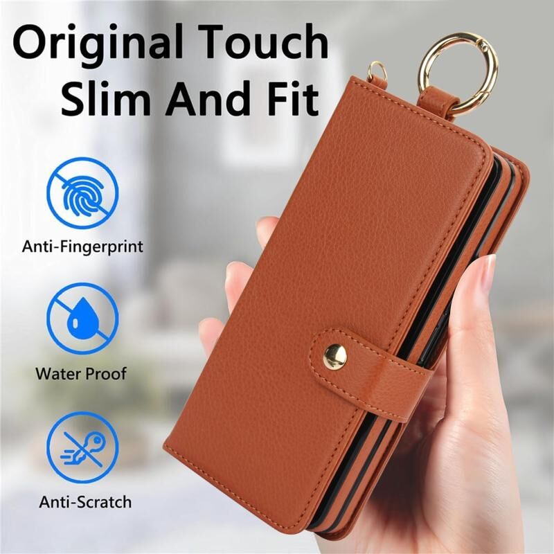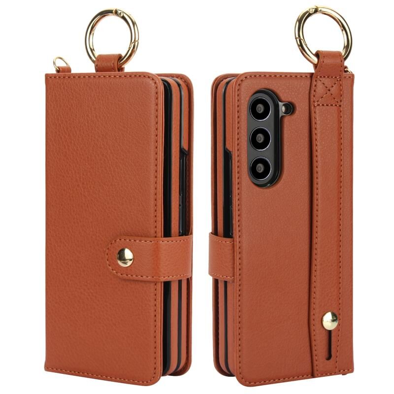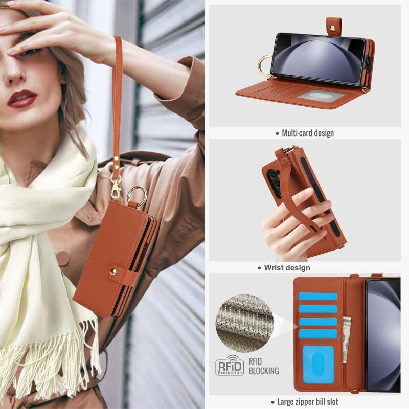 Θήκη τηλεφώνου Samsung Galaxy Z Fold6 από δέρμα με RFID, με λουρί και δακτύλιο για το καρπό, σε συμπαγές χρώμα (Μαύρο ανθρακονήματα).
