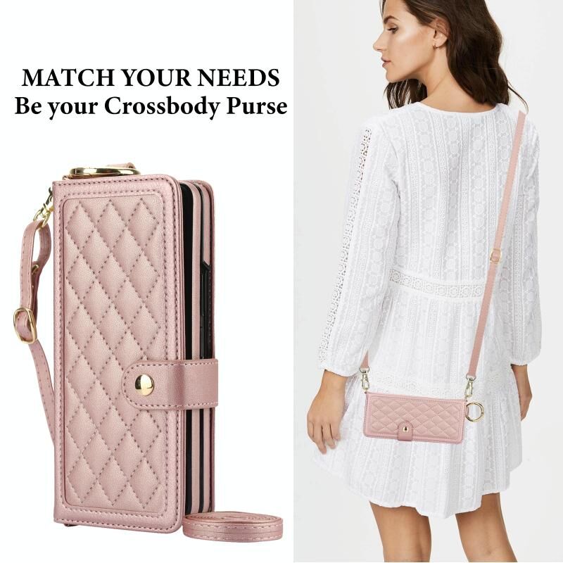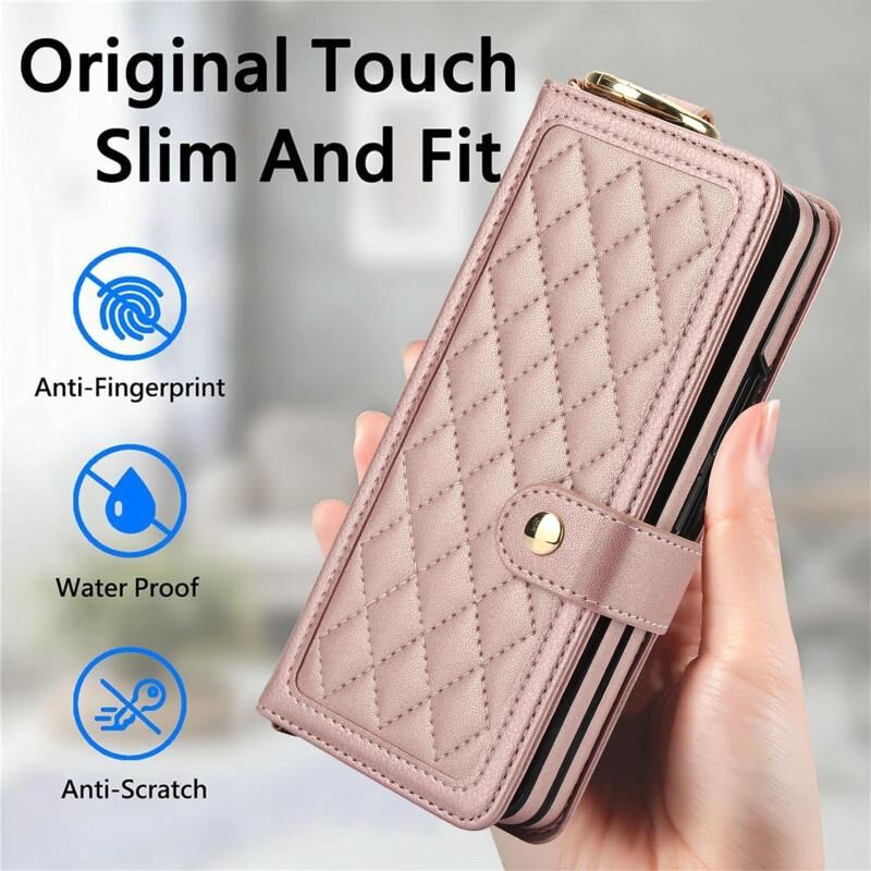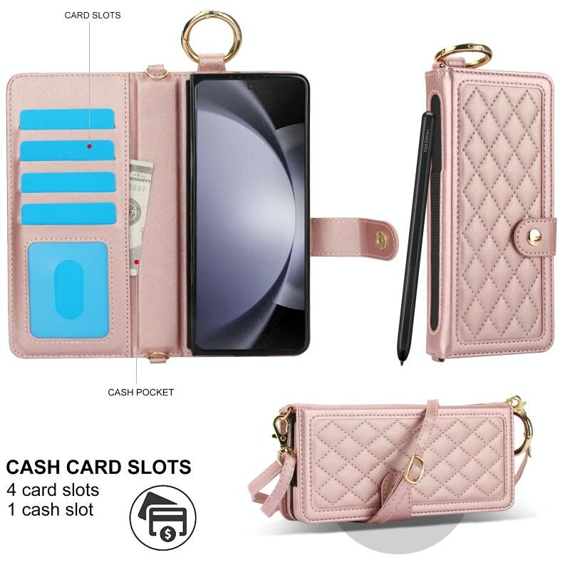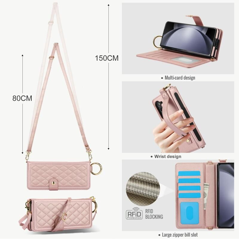 Για το Samsung Galaxy Z Fold6 Splicing Rhombic Υφή υπόθεση τηλεφώνου με μακρύ & κοντό κορδόνι, δεν περιλαμβάνεται στυλό (ροζ χρυσό)