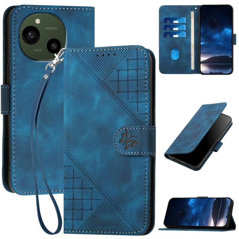 For Sharp Aquos R10 Grid Butterfly Embossed Pattern Leather Phone Case with Lanyard(Dark Blue)