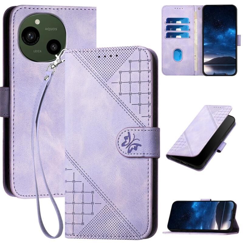 For Sharp Aquos R10 Grid Butterfly Embossed Pattern Leather Phone Case with Lanyard(Light Purple)
