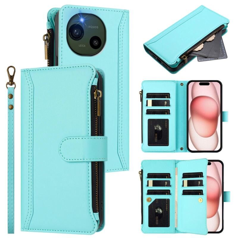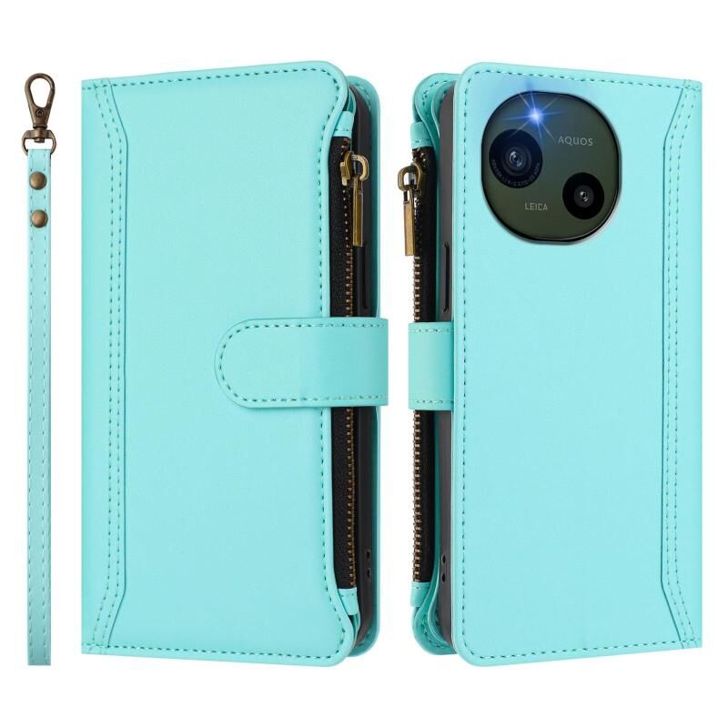 For Sharp Aquos R10 Magnetic Closure 9 Card Slots Zipper Leather Case with Hand Strap(Mint Green)