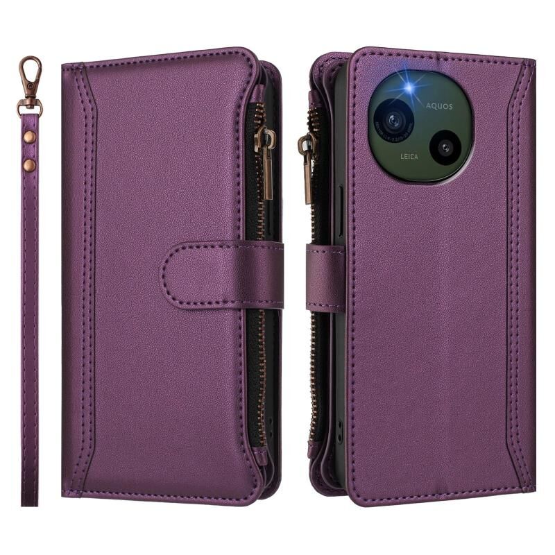 For Sharp Aquos R10 Magnetic Closure 9 Card Slots Zipper Leather Case with Hand Strap(Purple)
