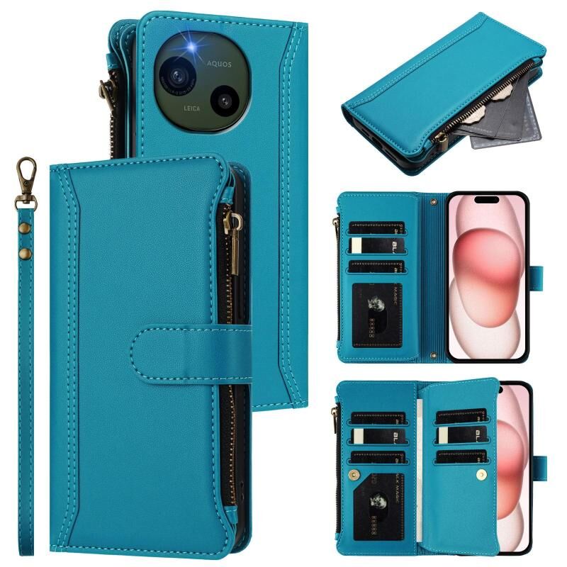 For Sharp Aquos R10 Magnetic Closure 9 Card Slots Zipper Leather Case with Hand Strap(Turquoise)