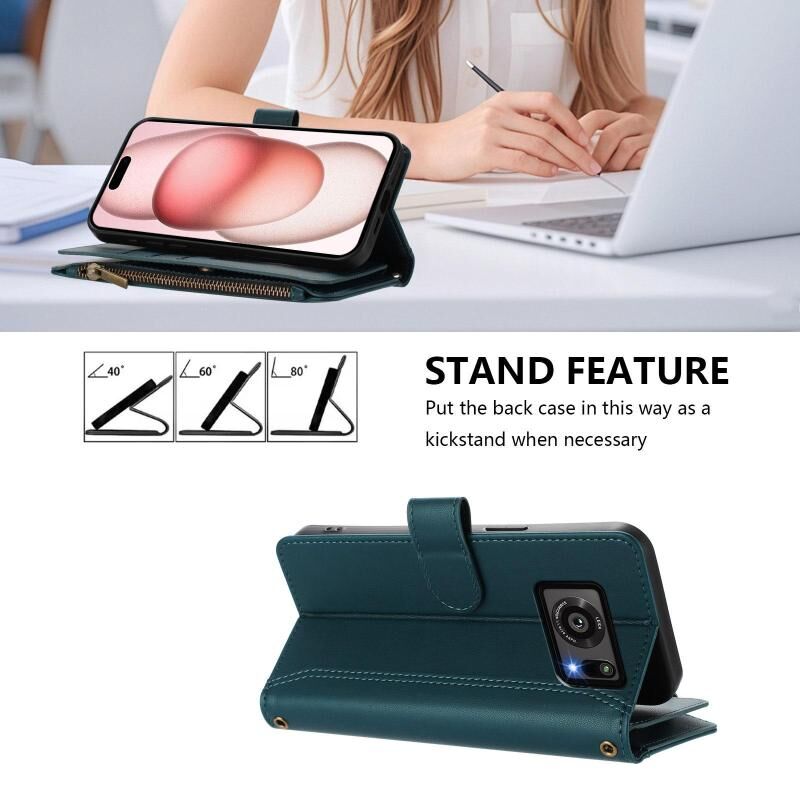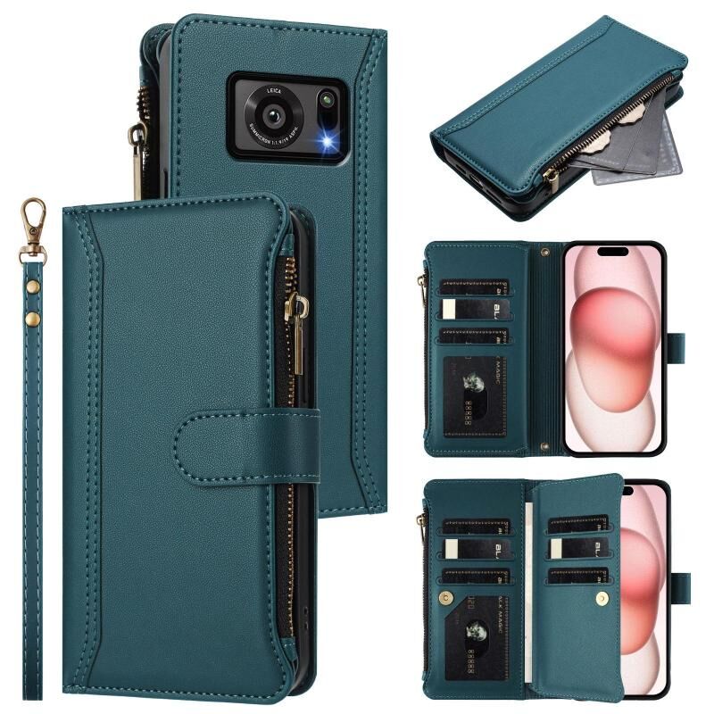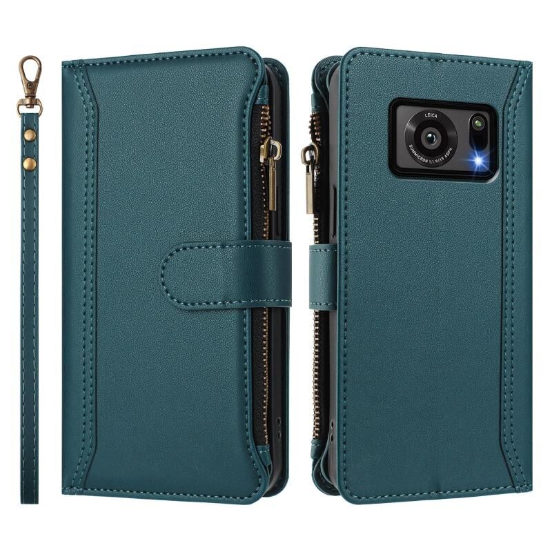 For Sharp Aquos R6 Magnetic Closure 9 Card Slots Zipper Leather Case with Hand Strap(Dark Green)