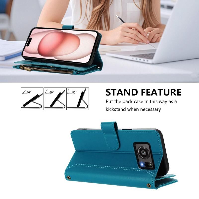 For Sharp Aquos R6 Magnetic Closure 9 Card Slots Zipper Leather Case with Hand Strap(Turquoise)