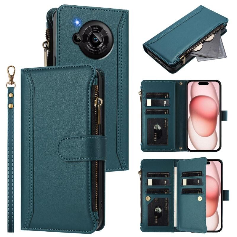For Sharp Aquos R7 Magnetic Closure 9 Card Slots Zipper Leather Case with Hand Strap(Dark Green)