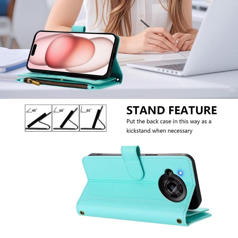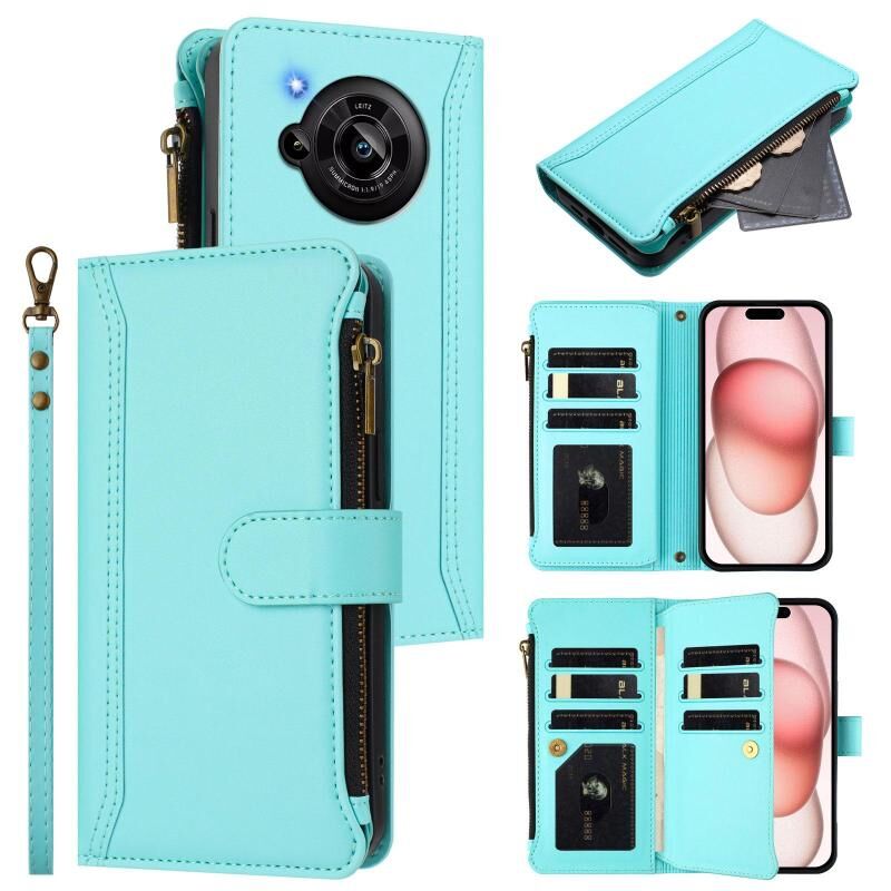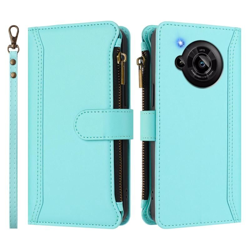 For Sharp Aquos R7 Magnetic Closure 9 Card Slots Zipper Leather Case with Hand Strap(Mint Green)