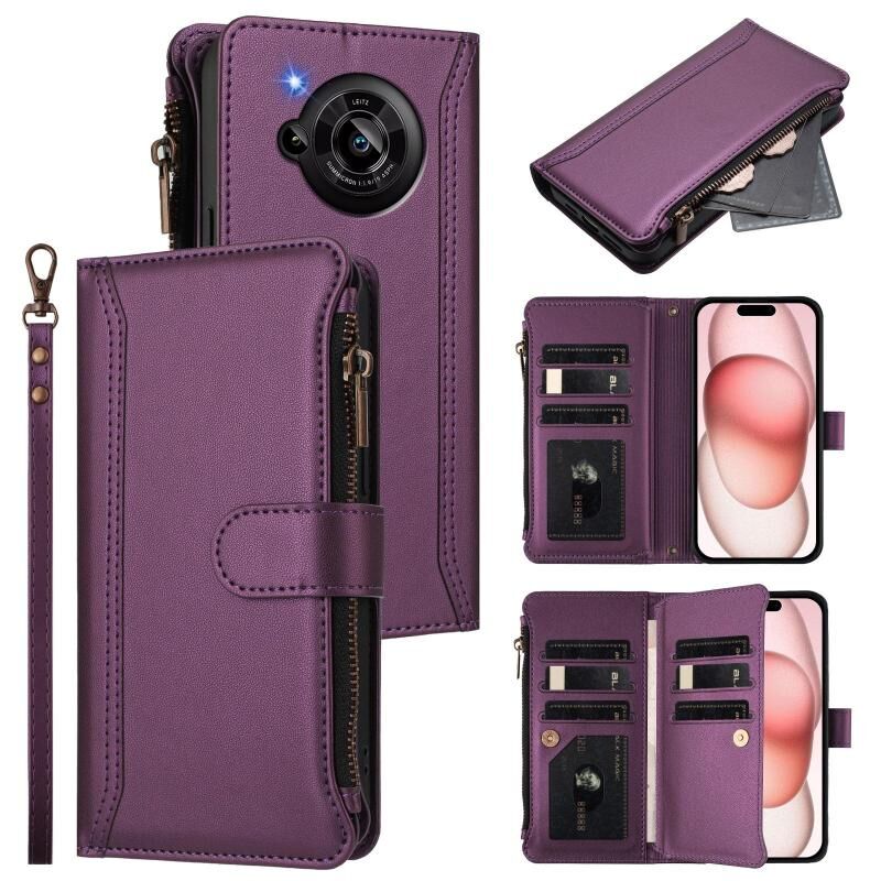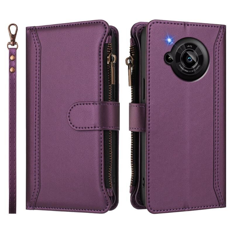 For Sharp Aquos R7 Magnetic Closure 9 Card Slots Zipper Leather Case with Hand Strap(Purple)