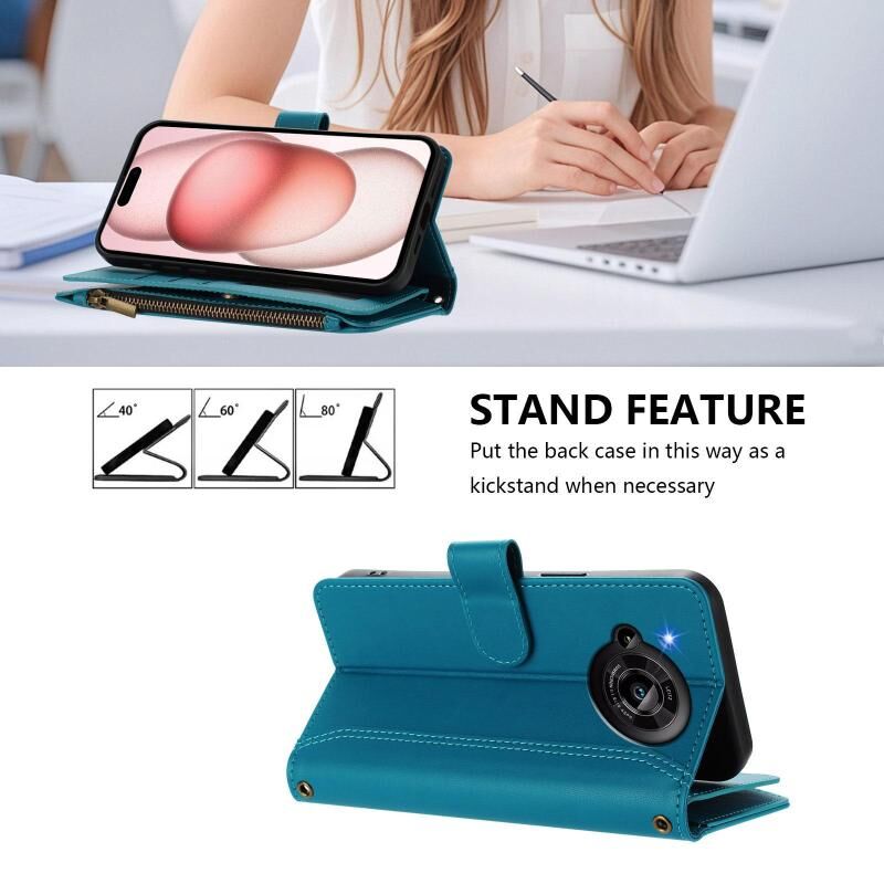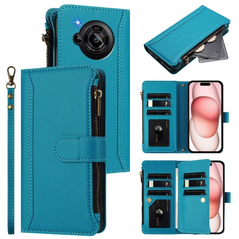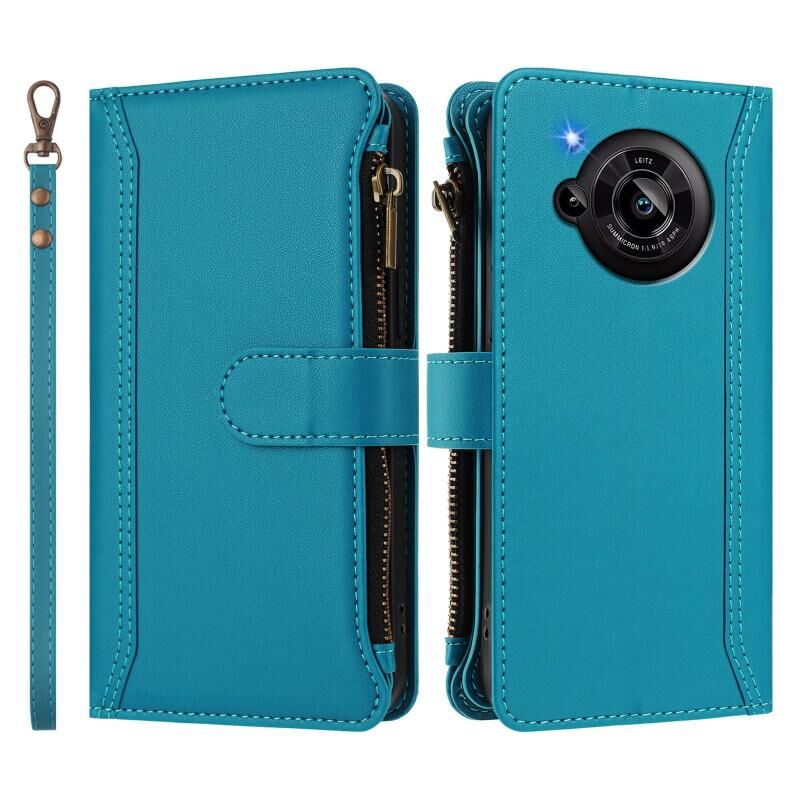 For Sharp Aquos R7 Magnetic Closure 9 Card Slots Zipper Leather Case with Hand Strap(Turquoise)