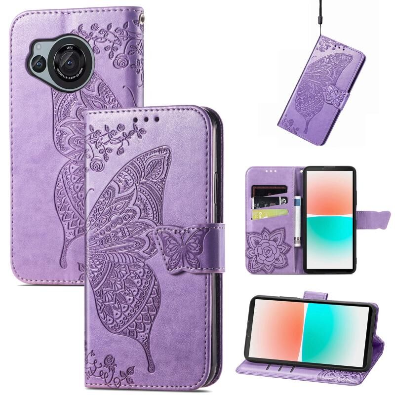 Θήκη τηλεφώνου από δέρμα με ανάγλυφο σχέδιο λουλουδιών για Sharp Aquos R8 Butterfly Love (Λεβάντα)