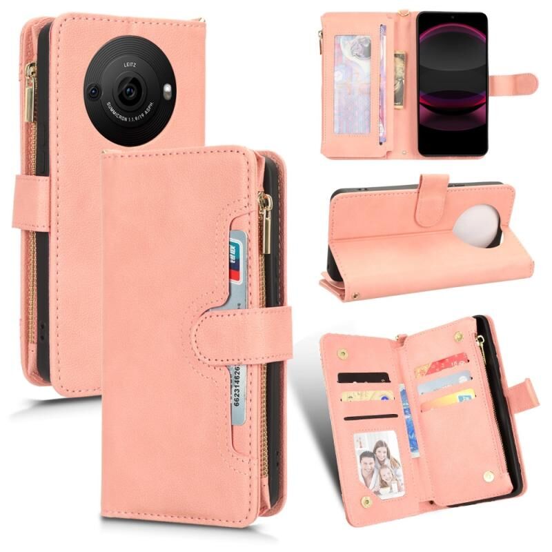 Θήκη τηλεφώνου από δέρμα με υφή λύτσι και φερμουάρ (Ροζ) για Sharp Aquos R8 Pro / Leica Leitz Phone 3