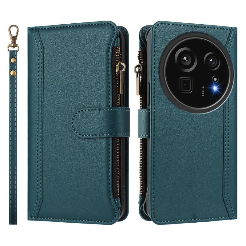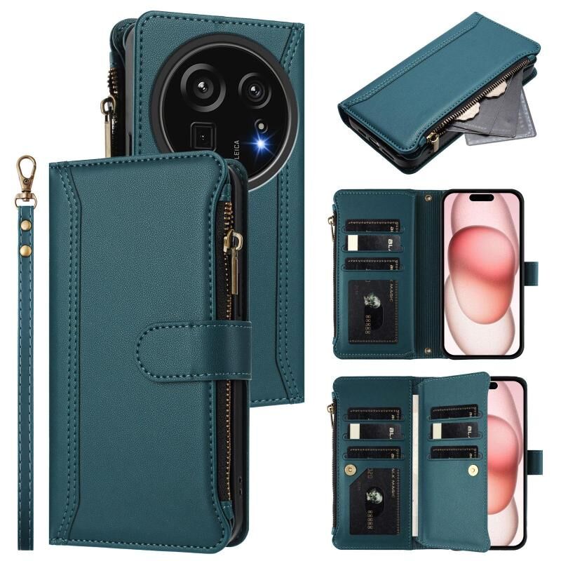 For Sharp Aquos R9 Pro Magnetic Closure 9 Card Slots Zipper Leather Case with Hand Strap(Dark Green)
