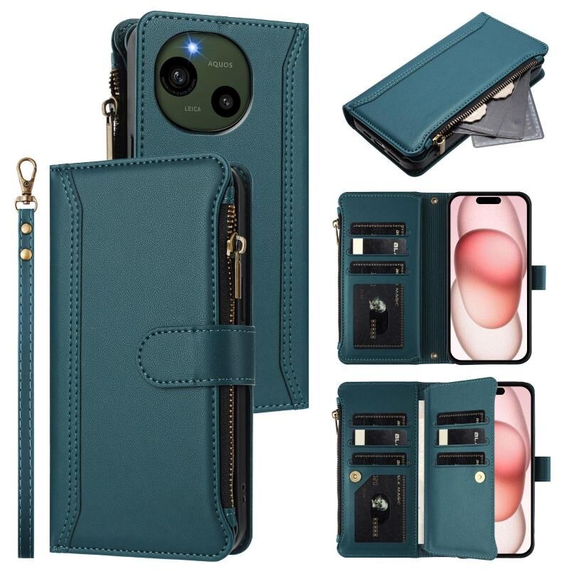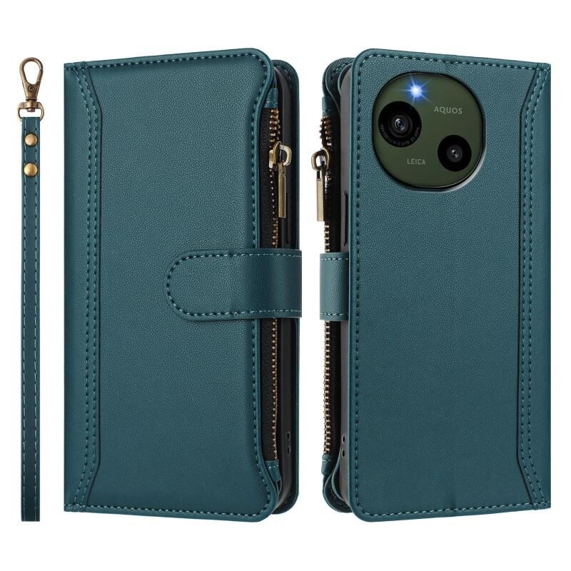 For Sharp Aquos R9 SH-51E Magnetic Closure 9 Card Slots Zipper Leather Case with Hand Strap(Dark Green)