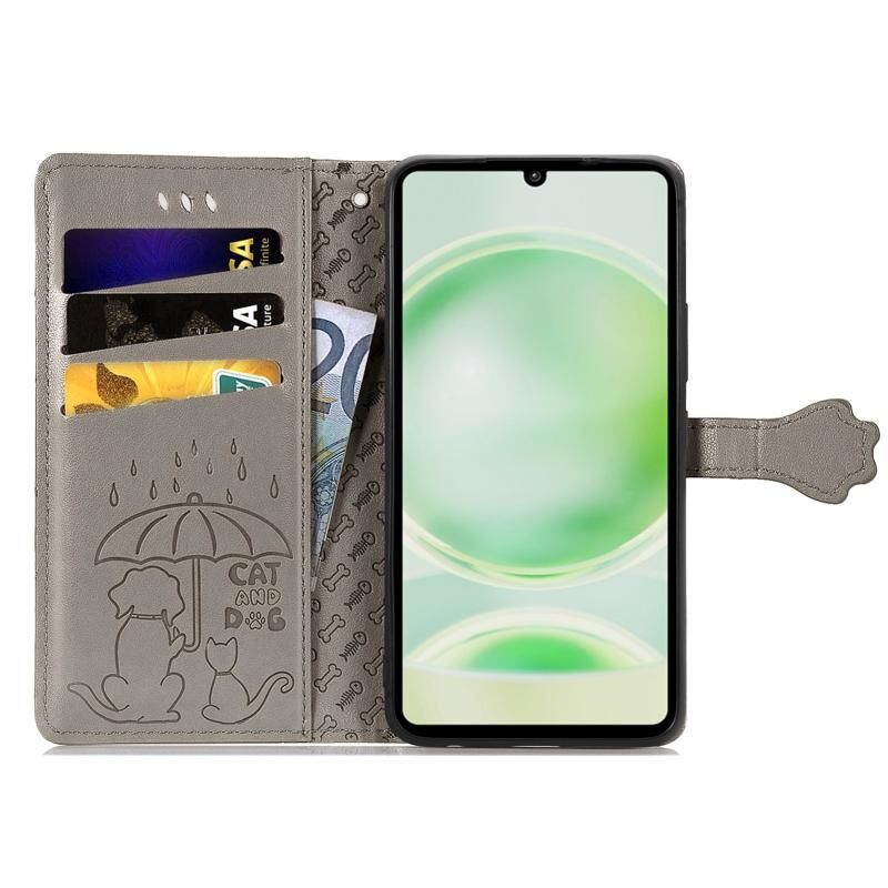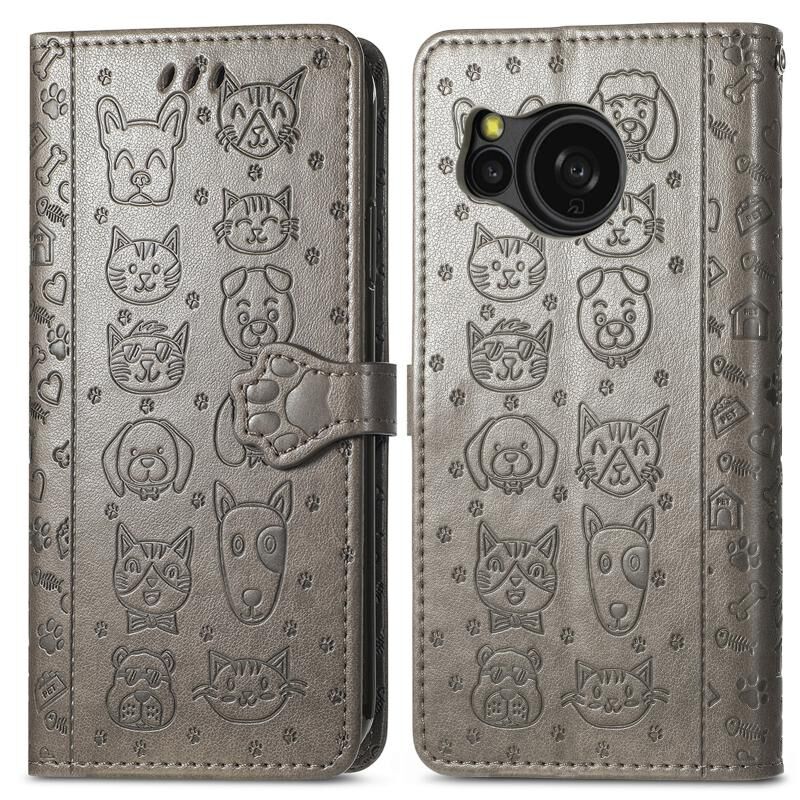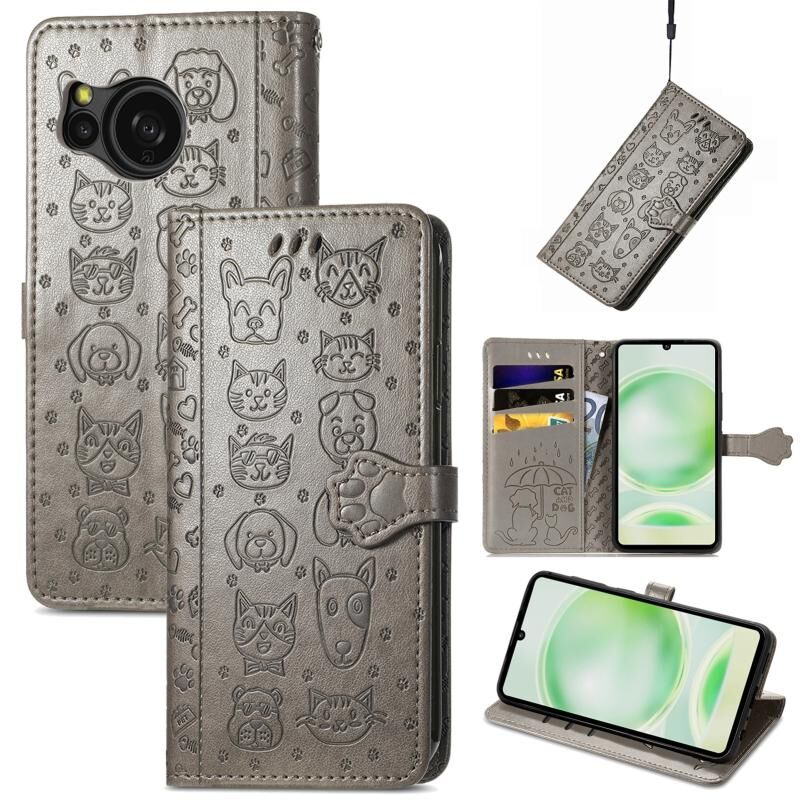 Για Sharp Aquos Sense8 Cat and Dog ανάγλυφη δερμάτινη θήκη τηλεφώνου (γκρι)