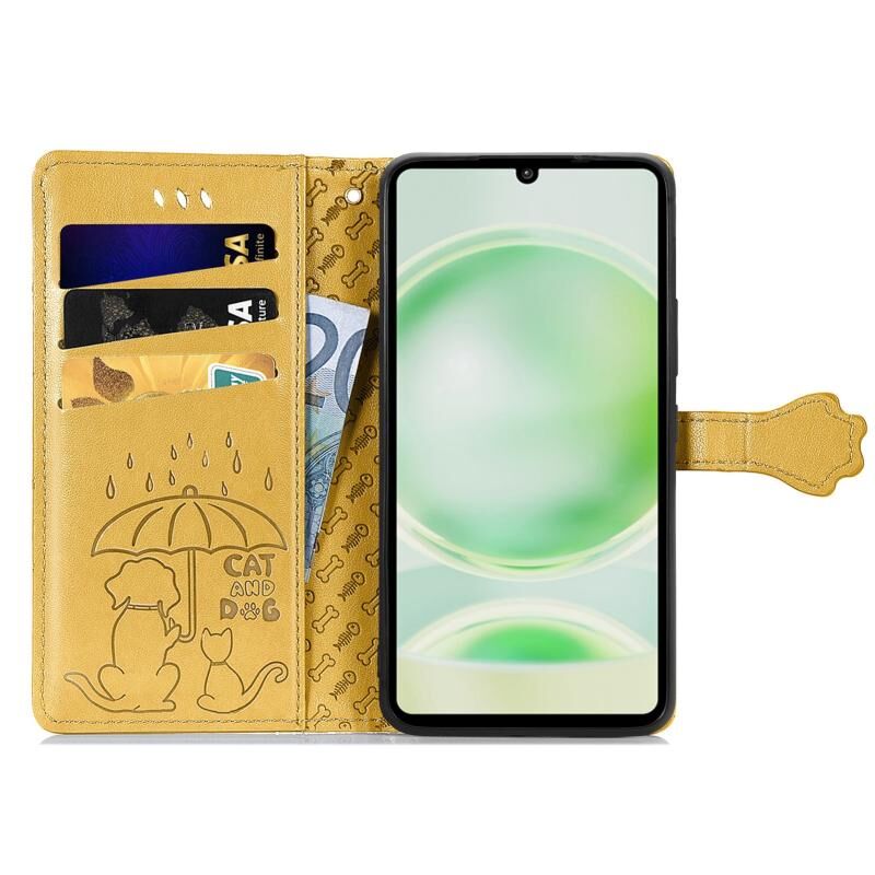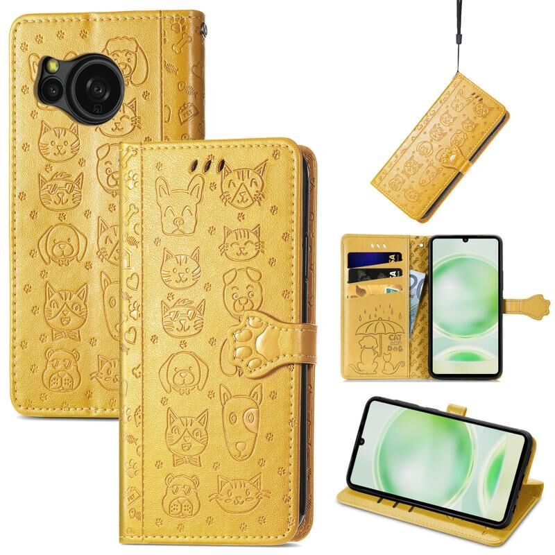 Για Sharp Aquos Sense8 Cat and Dog ανάγλυφη δερμάτινη θήκη τηλεφώνου (κίτρινο)