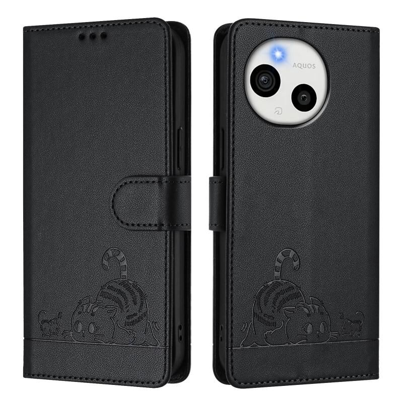 For Sharp Aquos Sense9 Plus Cat Rat Embossed Pattern RFID Leather Phone Case with Lanyard(Black)