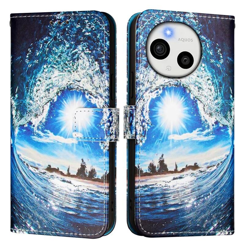 For Sharp Aquos Sense9 Plus Colored Drawing Pattern Plain Weave Leather Phone Case(Waves And Sun)