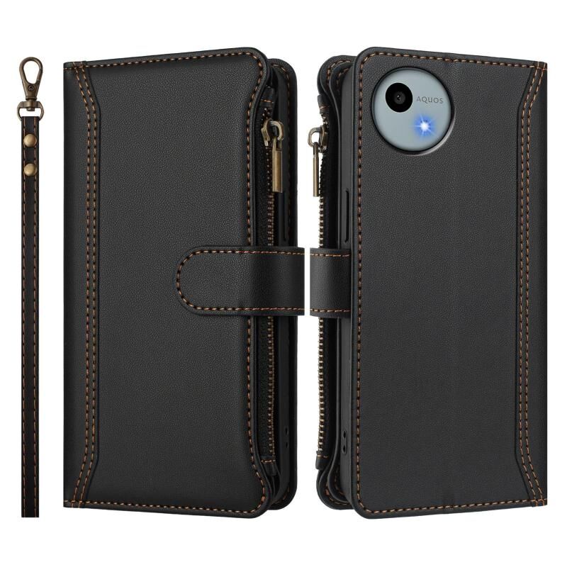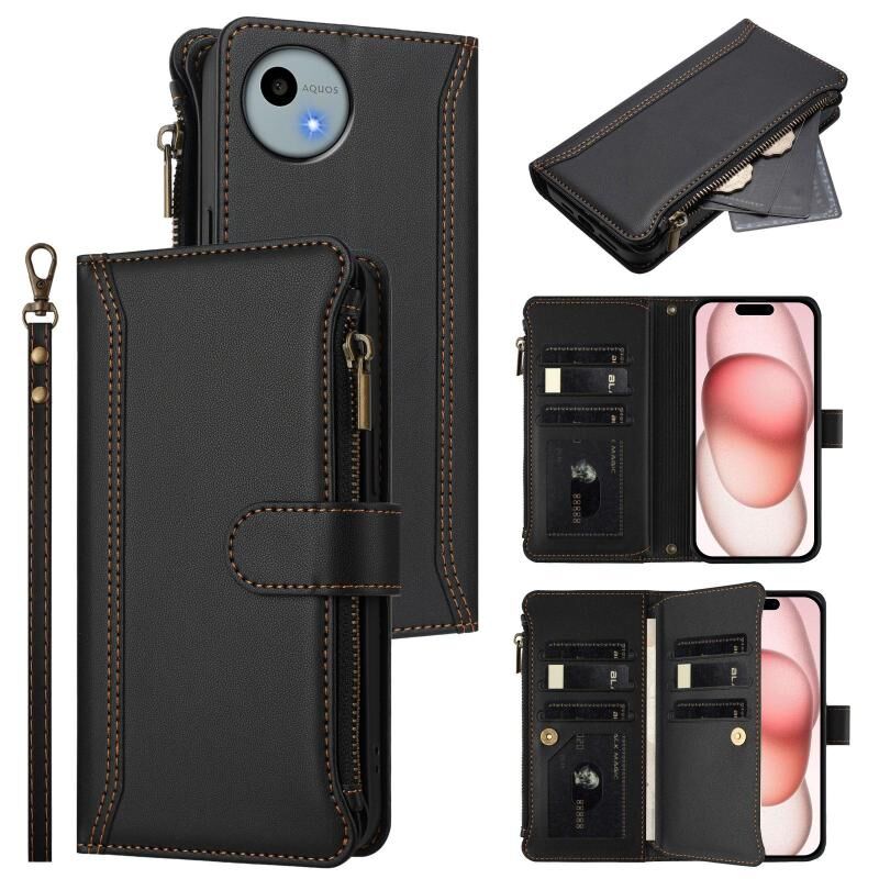 For Sharp Aquos wish4 Magnetic Closure 9 Card Slots Zipper Leather Case with Hand Strap(Black)