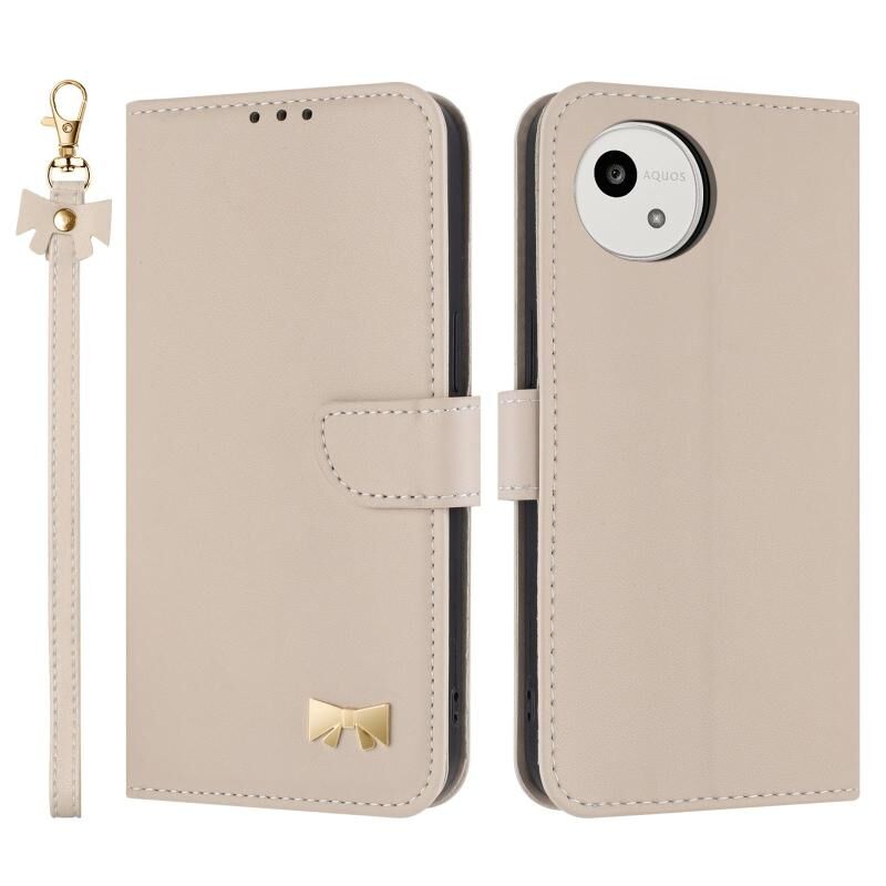 For Sharp Aquos wish5 Metal Bow Leather Phone Case with Hand Strap(Apricot)