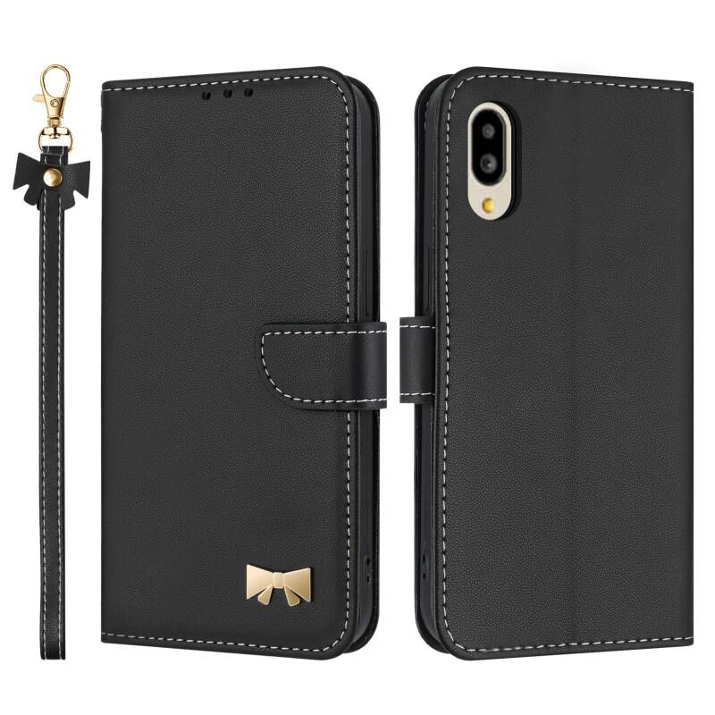 For Sharp Simple Sumaho 6 SHG09 Metal Bow Leather Phone Case with Hand Strap(Black)