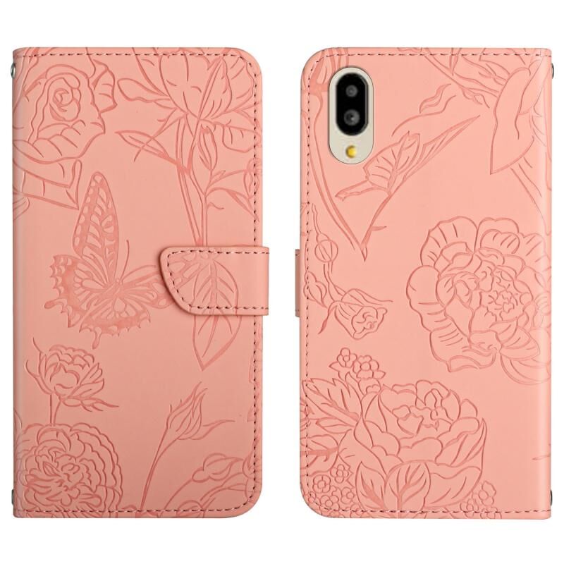 Θήκη τηλεφώνου από δέρμα με ανάγλυφο σχέδιο πεταλούδας και παιώνιας για Sharp Simple Sumaho 6 (ρόζ)